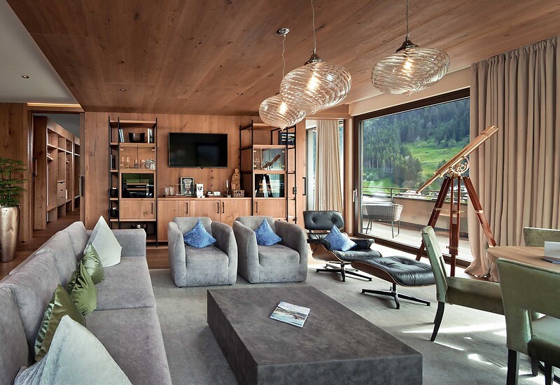Die großzügige HIGHLIGHT Suite lebt vom raffinierten Understatement seiner eleganten Ausstattung und der Energie der Naturmaterialien. Ausgesuchte Textilien und raumhohe Fensterfronten sorgen für eine lichte und lebendige Atmosphäre. Die einladende Couchlandschaft, der hochwertige Lounge-Chair im Wohnbereich sowie der Effektfeuer-Kamin versprechen Entspannung pur. Die extrabreite Veranda und die 200 m² Terrasse samt beheiztem Außenpool bilden das Herzstück dieser Suite. Sozusagen ein „Wohnzimmer im Freien“, für Ruhe und Privatsphäre. Die finnische Sauna „only for you“ sorgt für grenzenlose Erholung um neue Energie und Kraft zu tanken. Des Weiteren garantieren wir einen exklusiveren Zugang in den 8. Stock zu Ihrer Top Suite "Edelweiss".