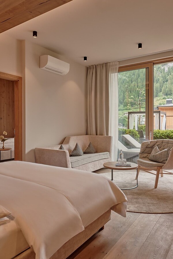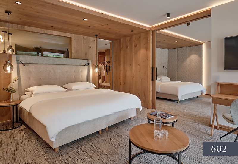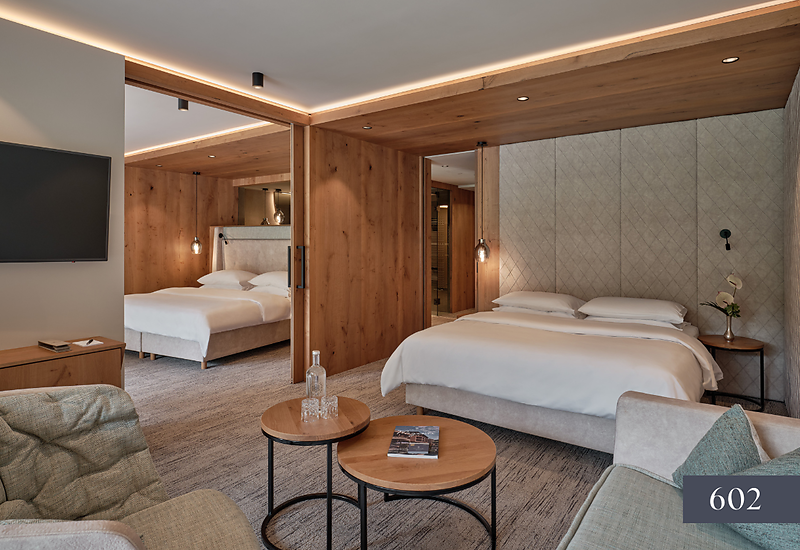 Located to the East - South / mainly wooden floor / 2 king size beds / sofa bed / seating area / 2 bathrooms with Aqua Clean WC / bathtub and shower & washbasin / Dyson Supersonic hair dryer / air conditioning / minibar first refill included / coffee machine & SMEG kettle / extensive loggia with seating and lounging area