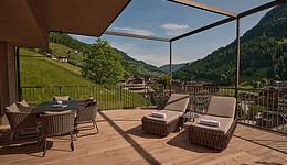 Zwei Sonnenliegen und runde Outdoor-Leuchten stehen auf einer großen Terrasse, dahinter ein grüner Hang mit dichtem Wald und klarer Bergkulisse.